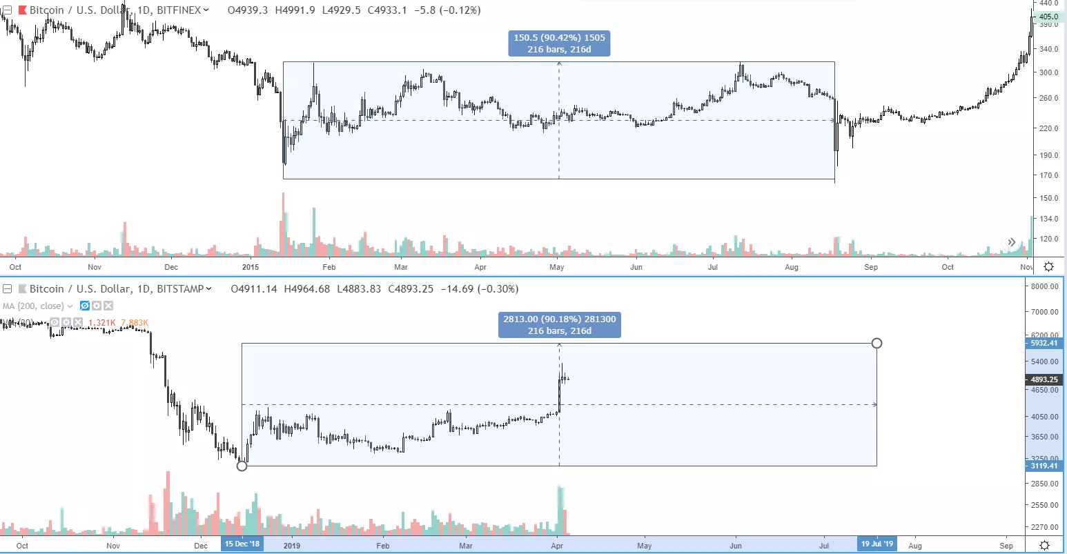Сравнение динамики движения цены биткоина в 2015 и в 2019 году. Дневные графики BTC/USD биржи Bitfinex от TradingView