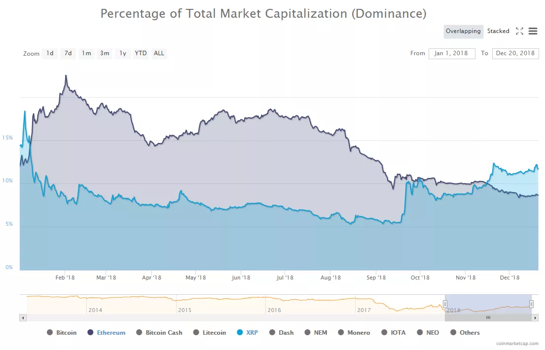 Более того, чуть позже с Ethereum случился тот самый flippening, о котором так много говорили в 2017 году. Правда, это не эфир обошел по капитализации биткоин, а он сам уступил второе место в рейтинге CoinMarketCap, которое теперь занимает монета XRP.