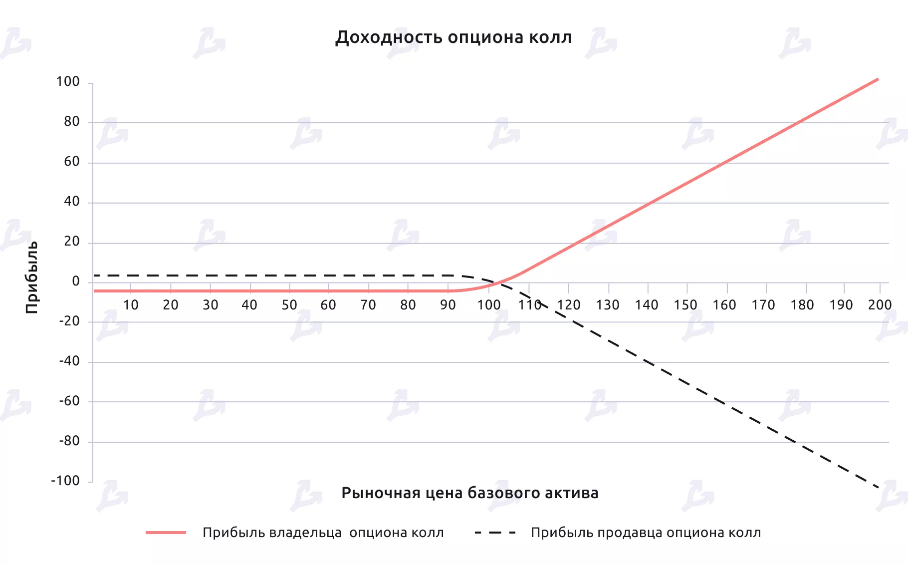 График доходности колл-опциона в зависимости от изменения цены базового актива. Страйк-цена = 100, премия по опциону = 10. Источник: wikipedia