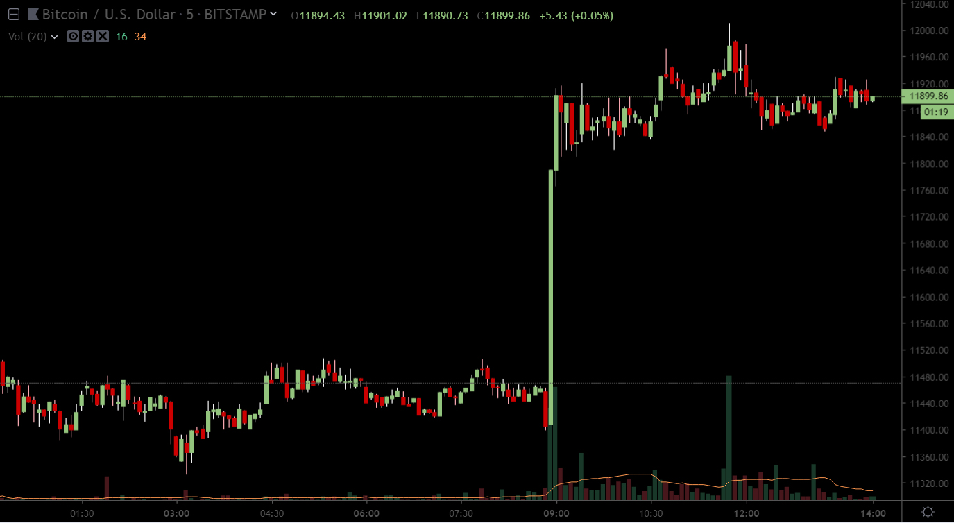 Today’s move towards $12,000 occurred as a result of a sudden $500 surge which lasted mere minutes. Since then, a slight correction saw BTC price dropping to around $11,900 (+4,25% over the last 24 hours).
