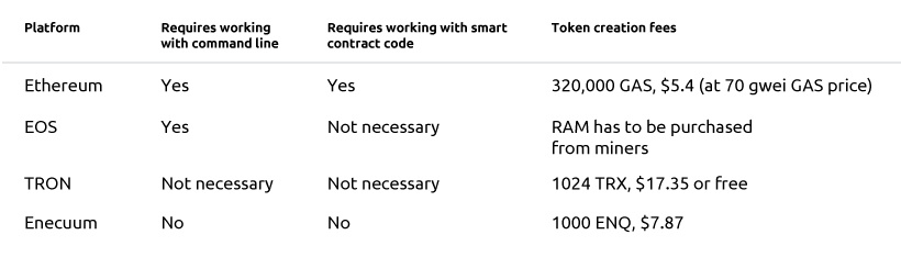 Comparison between token creation specs on Ethereum, EOS, TRON, and Enecuum