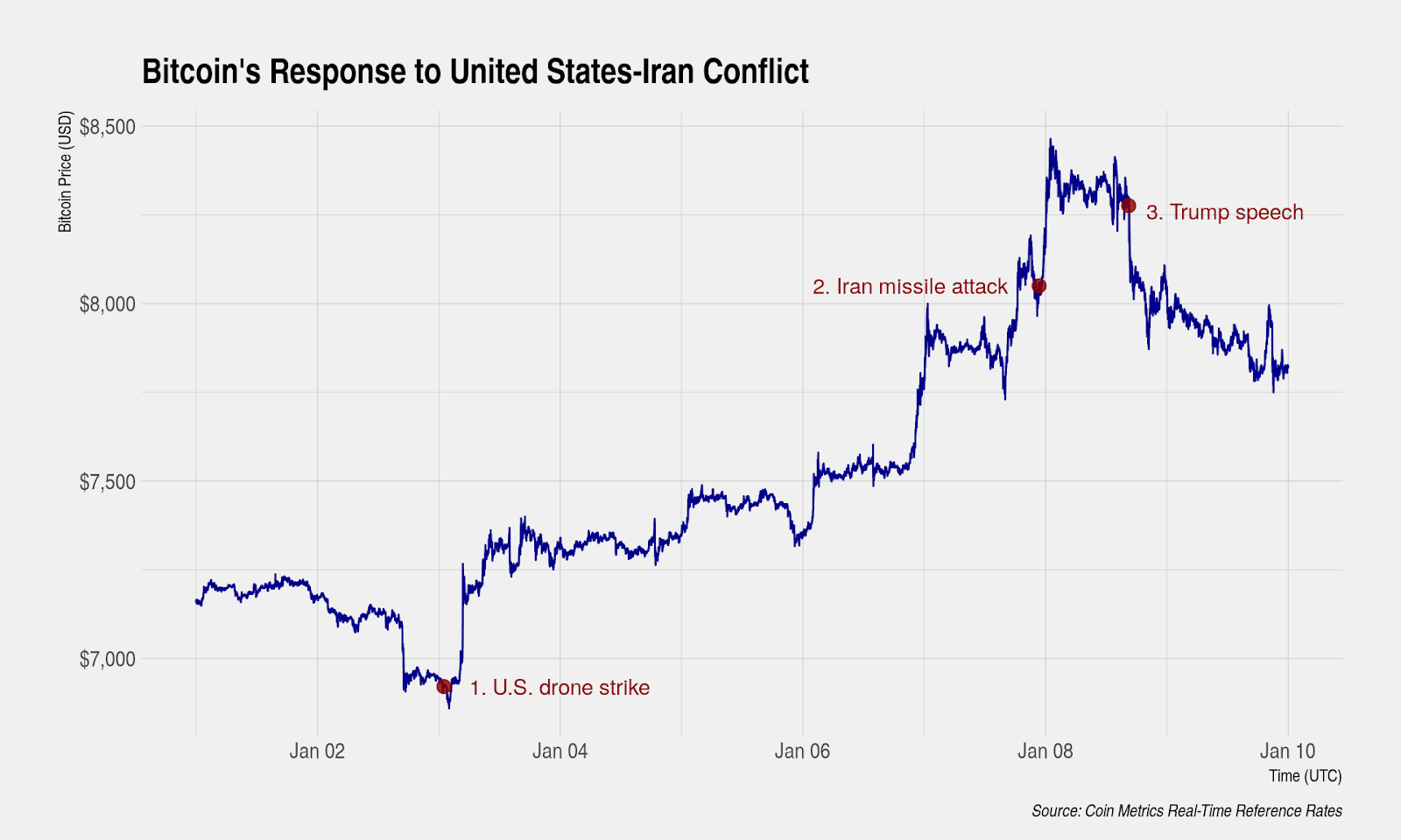 On January 8 Iran launched several missiles at a U.S. military base in Iraq. The markets reacted immediately: oil and gold shot up and Bitcoin rose above the $8,400 mark. A single week of geopolitical turmoil saw Bitcoin growing by almost 20%.