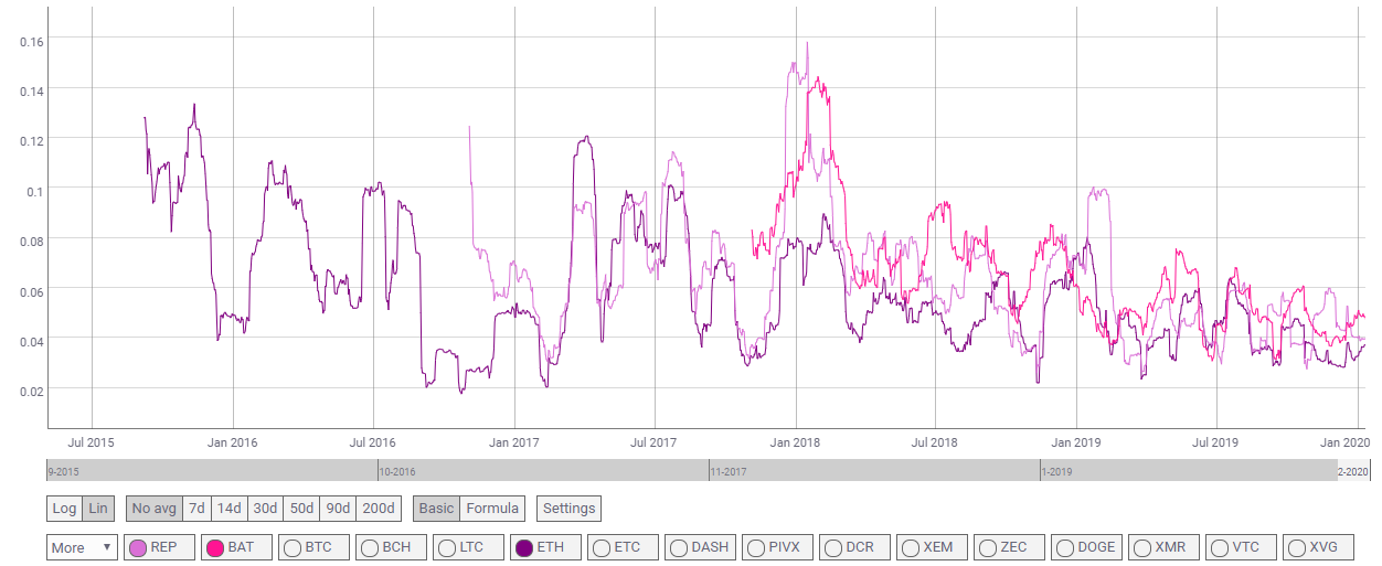 BAT and REP are more volatile than ETH, even though their volatility has become much lower since early 2019.