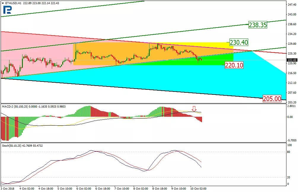 На часовом графике Ethereum можем увидеть преодоление линии поддержки краткосрочного канала роста. Тенденция роста была коррекцией внутри нисходящего тренда. Пробой поддержки сопровождался формированием «Черных крестов» на Stochastic и MACD, что может быть дополнительным подтверждением развития нисходящего тренда.