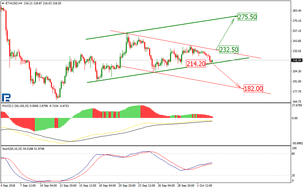 В настоящий момент котировки Ethereum демонстрируют тестирование линии поддержки среднесрочного канала роста. Текущая ситуация может быть охарактеризована как консолидация перед стремительным импульсом. Пробой уровня сопротивления $232,50 может позволить котировкам подняться до $275,50. Соответственно пробой уровня поддержки $214,20 может открыть путь для развития нисходящего тренда к уровню поддержки 182,00, а далее — к ключевому минимуму.