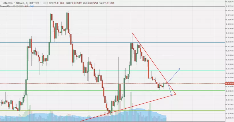 — LTC/BTC пробивает линию медвежьего тренда и начинает коррекцию на повышение. Здесь необходимо понимать, является ли это укреплением самого лайткоина или падением BTC. В случае, если это действительно укрепление, то после пробития можно покупать;