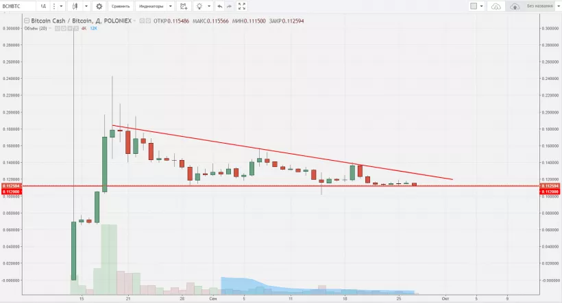 Bcash находится в медвежьем тренде, консолидируясь в виде фигуры «флаг». Если она отработает, нас ждет очередной аптренд. При этом затухание объемов говорит о том, что это, скорее всего, не произойдет в ближайшей перспективе. Уровень 0,112 можно было бы рассмотреть как точку входа на покупку, однако ввиду низкой волатильности актива, торопиться не стоит.