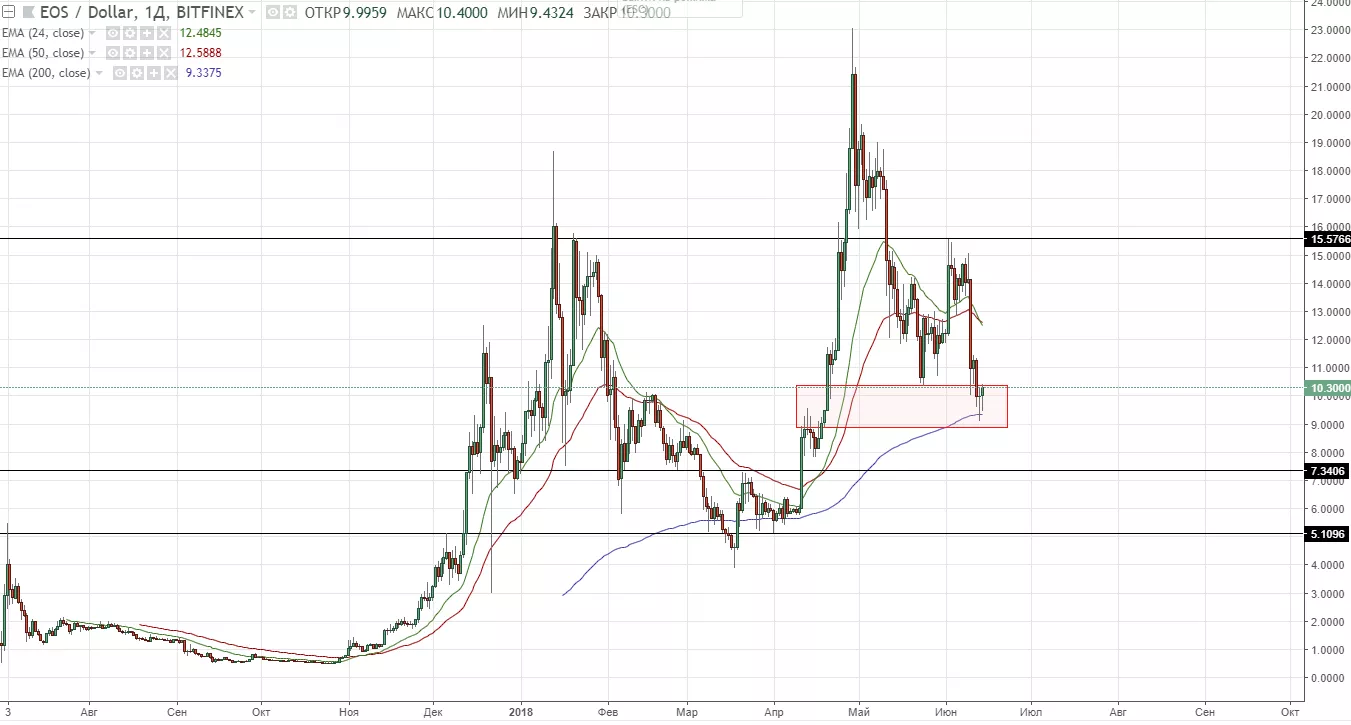 В настоящее время цена тестирует область $0.56 – $0.45. Если цене удастся пробить и закрепится ниже отмтки $0.45, нисходящий тренд будет продолжен.