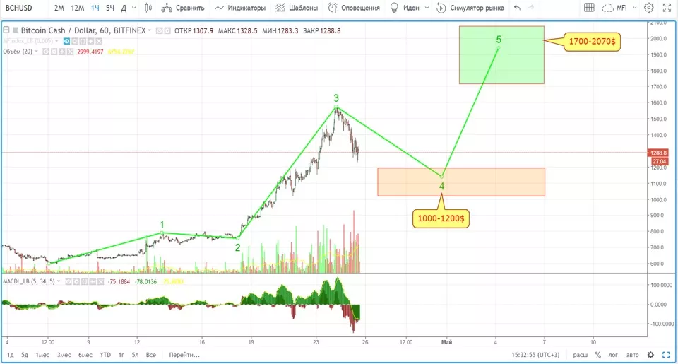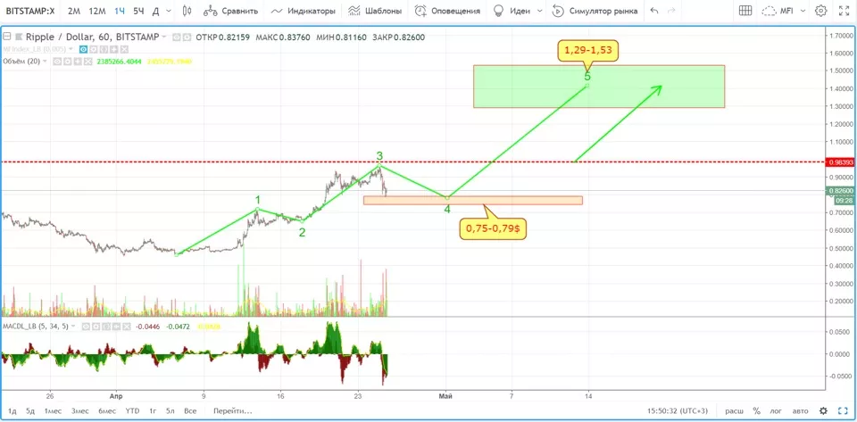 Май традиционно для Ripple является месяцем роста. Среднесрочный диапазон роста XRP ограничен зоной $1,28-1,53. Снижение в рамках волны 4 не имеет потенциала, и, скорее всего, встретит мощное сопротивление со стороны покупателей. Прорыв отметки $0,98 окончательно застолбит право покупателей контролировать рынок.