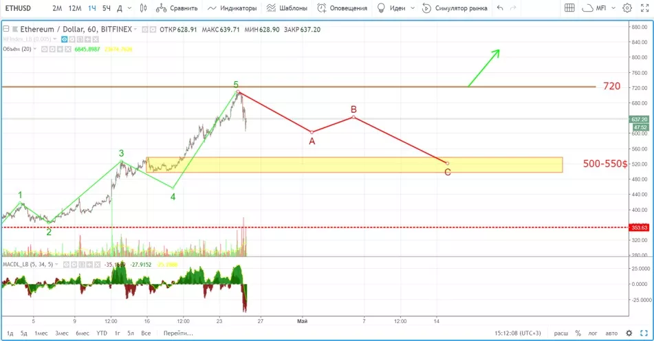 Ethereum потерял восходящий импульс и вошел в стадию краткосрочной коррекции A-B-C, целью которой является диапазон $500-550. В рамках волнового анализа окончание коррекции послужит началом волны 3 восходящего цикла. Пробой уровня $720 укажет на устойчивый рост в рамках этой волны.