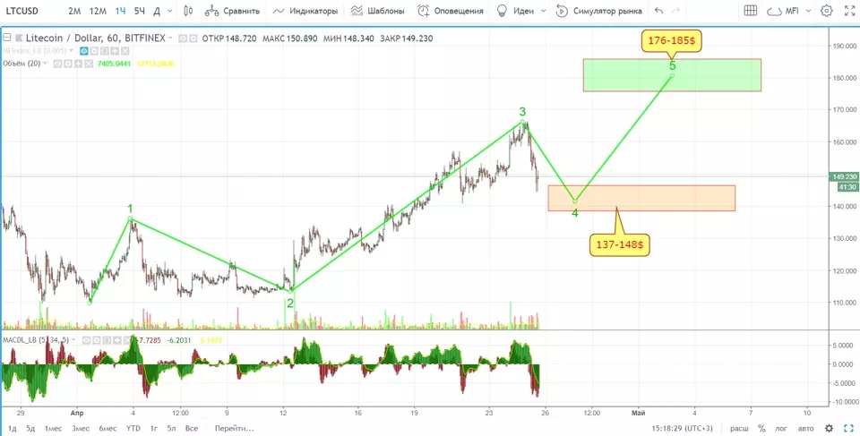 Litecoin в паре с долларом демонстрирует коррекционное снижение в рамках волны 4. Потенциал ее снижения находится в пределах $137-148. После этого целью движения волны 5 станет зона $176-185.