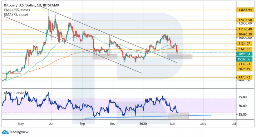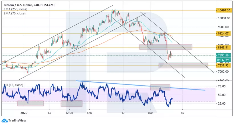 Медведи продолжают двигать цены активов дальше вниз. В очередной раз были пробиты ближайшие уровни поддержки. Хорошим уровнем для отскока вверх на дневном графике Bitcoin выступает область у отметки $7335.