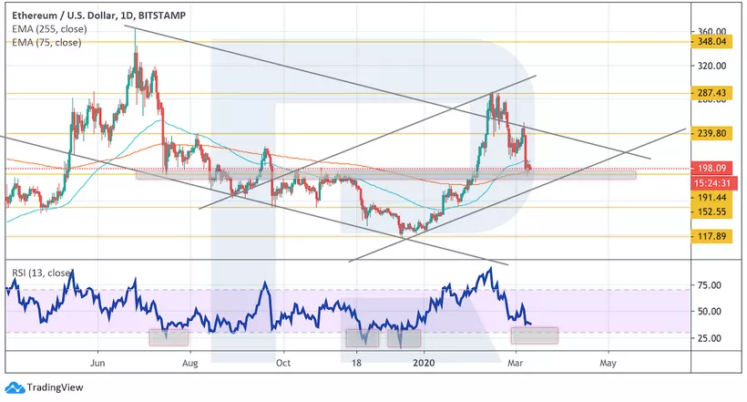 Покупателям Ethereum удается удерживать цену в области между Скользящими средними, откуда стоит ожидать попытки отскока вверх. Здесь же, вблизи уровня $190, располагается важная область поддержки.
