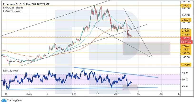 На более мелких временных промежутках есть высокий потенциал для формирования разворотной модели «Клин». Однако целевой областью снижения все еще выступает поддержка между уровнями $195-180. Уже после теста данной области можно говорить о попытке разворота цены вверх.