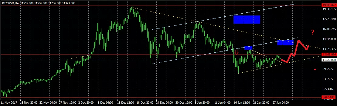 Исходя из графика, могу предположить, что в первой половине недели будет вновь предпринята попытка движения вниз в район $10800-10500. После этого начнется восстановление и снова сформируется свеча с нижней тенью. Для уверенного движения в район $14 000 “быкам” необходимо набрать некоторый разгон.