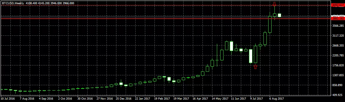 Если рассмотреть график поближе, то можно увидеть, что цена уперлась в сопротивление в районе $4100 и стала монотонно откатывать. В прошлом обзоре я предположил, что именно эта зона станет сопротивлением при движении вверх, именно так и случилось.