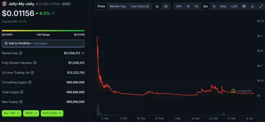 В результате всего за час цена Jelly-My-Jelly взлетела более чем на 500% — с $0,00806 до $0,0517.