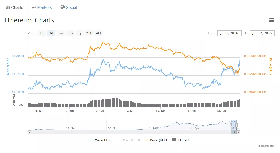 На фоне укрепления биткоина, вторая по рыночной капитализации криптовалюта Ethereum, пройдя путь от $13.7266 за одну монету в понедельник, 6 июня, до краткосрочной пиковой цены $14.7999 в прошедший четверг на бирже Kraken. Однако еще в четверг наметился тренд на снижение цены, и сегодня цена токенов Ethereum равняется $14.83, а их совокупная стоимоть на рынке составляет более $1,200 млрд.