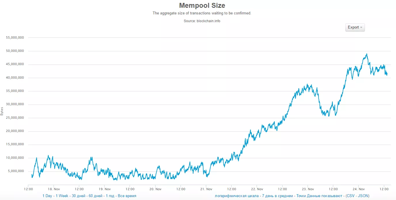 Пул памяти (мемпул) сети биткоина в очередной раз в этом году оказался забит слишком большим количеством неподтвержденных транзакций. Начиная с понедельника, 21 ноября, их число неуклонно росло и достигло пика в четверг, 24 ноября, когда, по данным bitcointicker, неподтвержденными были более 50 тысяч транзакций. На момент публикации график показывает некоторое снижение числа неподтвержденных транзакций и их общего размера. Однако в целом такая ситуация, конечно, не может не вызывать беспокойства, в очередной раз напоминая о необходимости как можно более скорейшего решения вопроса масштабирования сети.