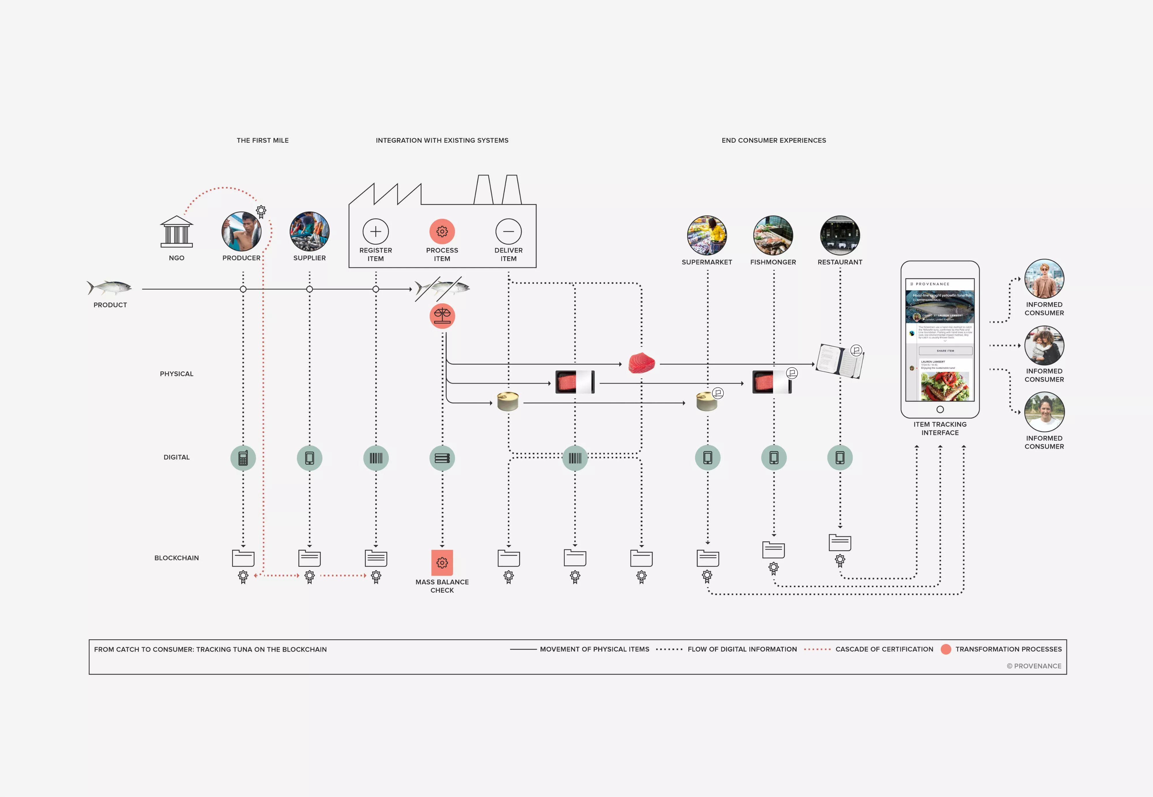 По статистике, до 30% всей рыбы, потребляемой в мире, вылавливается либо незаконно, либо с применением запрещенных методов. В некоторых странах, таких как Украина, Мексика и Бразилия доля незаконного улова составляет 90%. Оригинальный метод решения этой проблемы предлагает крупный британский потребительский кооператив The Co-op Food. Так, он запустил решение, основанное на блокчейне, которое позволяет проследить весь путь поставляемых в магазины и рестораны морепродуктов, начиная с момента вылова и заканчивая корзиной потребителя.