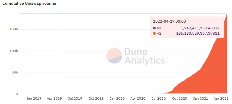 Доля Uniswap в совокупном объеме торгов на DEX стабильно превышает 50%. Данные: Dune Analytics по состоянию на 30.04.2021.
