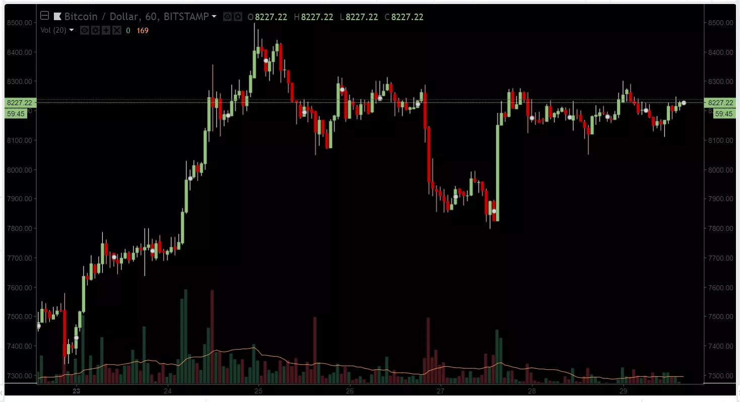 Как видно на графике выше, начав неделю с отметки около $7500, первая криптовалюта уверенно пошла вверх в понедельник, пробив на следующий день психологический барьер в $8000 и в какой-то момент даже вплотную приблизившись к $8500.