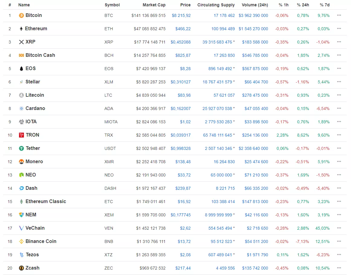 Среди Топ-20 цифровых активов наилучшие показатели на этой недели продемонстрировали VeChain (+45%), Binance Coin (+12,5%), Zcash (+10,5%), Tron (+9,6%) и Stellar (+5,4%).