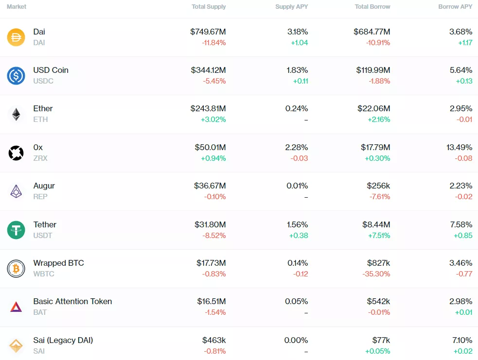 В данном сегменте лидирует Compound. В таблице ниже представлены все рынки этого сервиса, отсортированные по стоимости заблокированных активов.