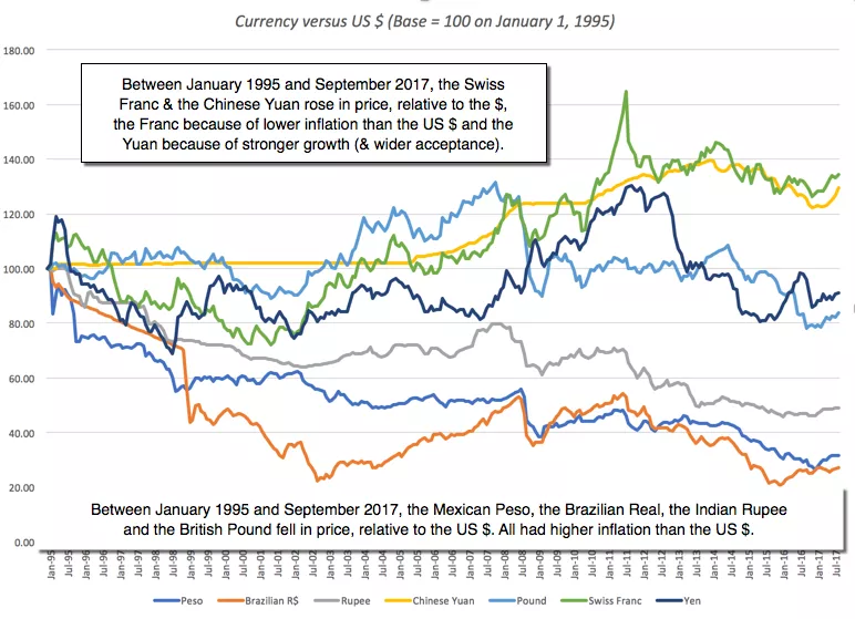 - Валюта является средством обмена, а также используется для оценки денежных потоков. Кроме того, валюта может служить средством сохранения стоимости в случае, если вы решили ее не инвестировать. Сами по себе валюты не генерируют денежные потоки и, следовательно, их внутреннюю стоимость определить нельзя. С другой стороны, их цены можно сопоставить с другими валютами. В долгосрочном периоде те валюты, которые более широко распространены в качестве средства обмена и которые с течением времени лучше сохраняют свою покупательную способность, растут в цене по отношению к другим валютам, не обладающими такими характеристиками. Однако в краткосрочном периоде могут доминировать и другие факторы. В частности, правительства могут осуществлять действия, способные повлиять на валютный курс. Используя более привычный пример валют, на графике, где изображены курсы доллара США и семи других фиатных валют, можно увидеть, как в долгосрочном периоде (1995-2017 гг) по отношению к американской валюте растут в цене швейцарский франк и китайский юань; с другой стороны, можно увидеть как падают в цене мексиканский песо, бразильский реал, индийская рупия и британский фунт.