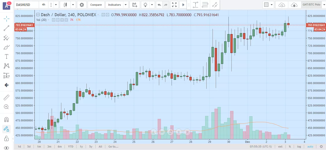 На графике биржи Poloniex можно увидеть, что цена этой криптовалюты последние несколько дней торгуется вблизи отметки $800. Впервые отметку в $700 цена DASH преодолела в среду, 29 ноября.