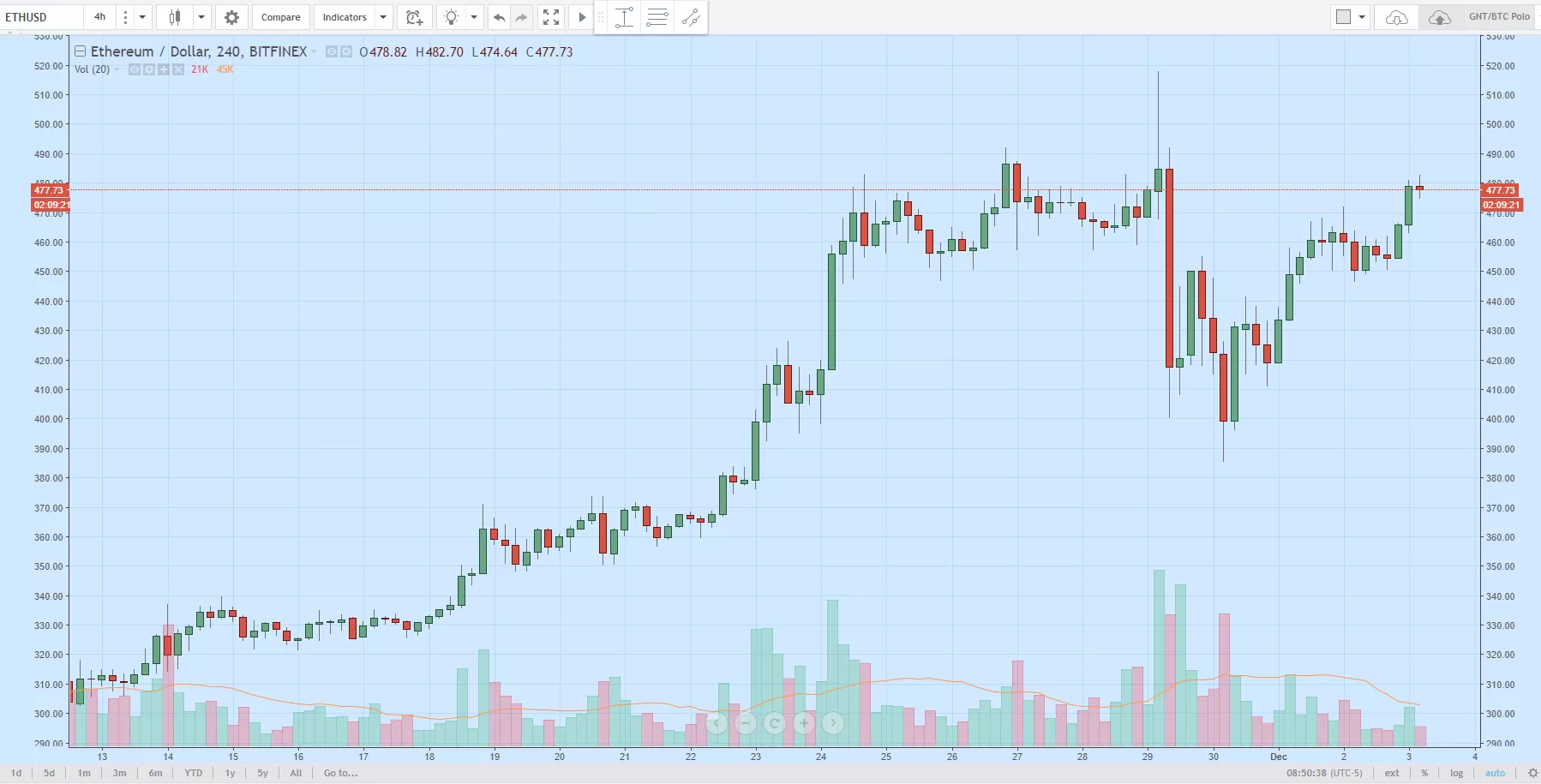 Криптовалюта Ethereum, в целом, продолжает рост. В начале недели ETH впервые удалось достичь отметки в $500. После этого произошел откат до уровня в районе $400, после которого последовало уверенное восстановление курса второй по капитализации криптовалюты. В настоящее время Ethereum вновь приближается к ценовому максимуму.