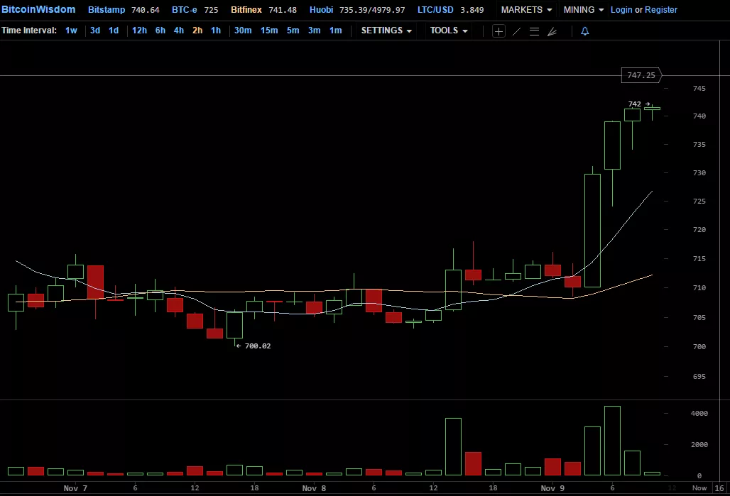 На момент публикации (08:30 UTC) биткоин торгуется в районе $740 на Bitfinex и $738 на Bitstamp.