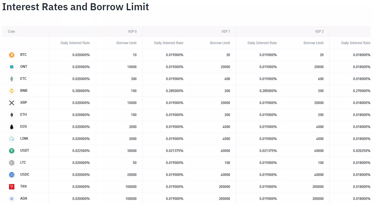 На отдельной странице сайта Binance можно посмотреть перечень активов, доступных для торговли «с плечом»: