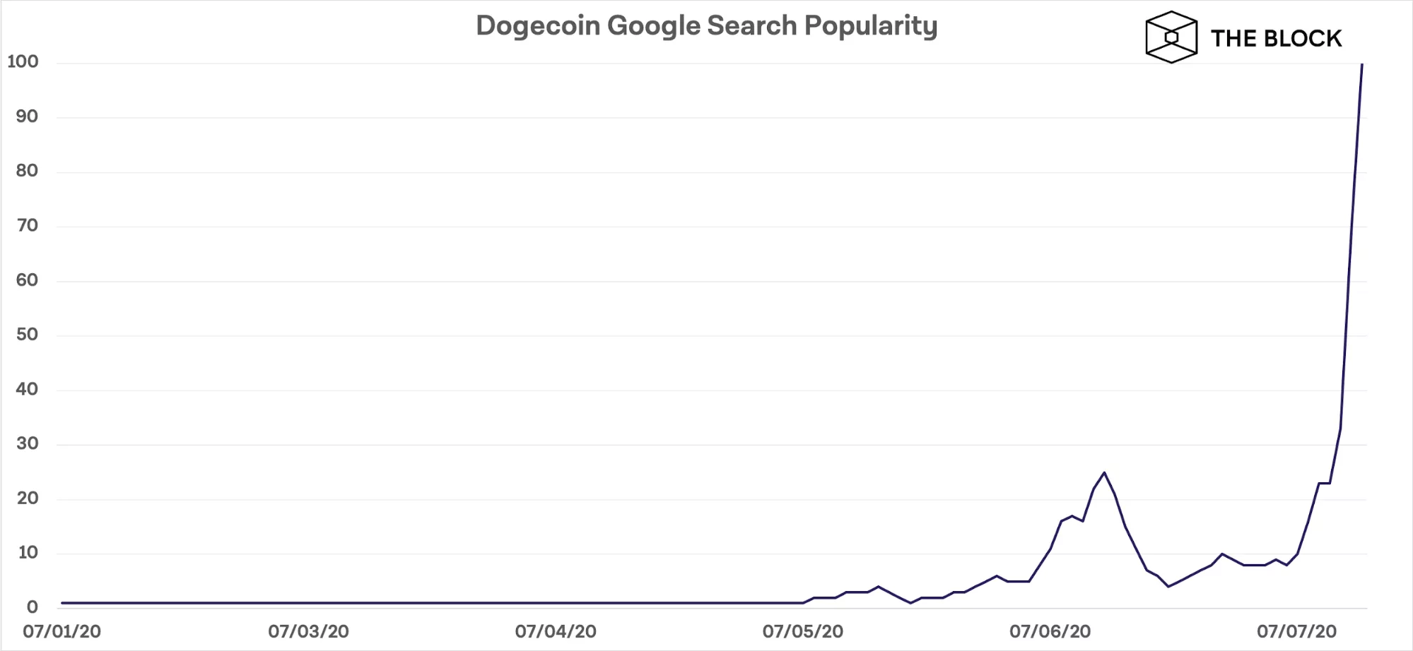 Недавно в соцсети TikTok появилось вирусное видео, в котором автор призывает людей инвестировать по $25 в DOGE и ждать, когда монета вырастет до $1. На фоне этого интерес к криптовалюте значительно вырос. С начала июля индекс популярности запроса «dogecoin» в Google подскочил почти в 100 раз, достигнув максимальной отметки.