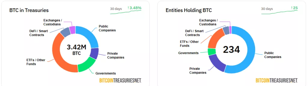 Согласно BitcoinTreasuries, уже 234 фирм держат в общей сложности 820 542 BTC.