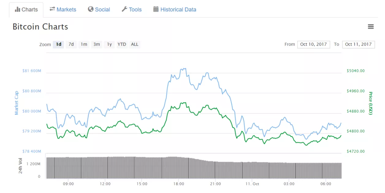 По состоянию на 07:30 GMT среды, 11 октября, средневзвешенный курс криптовалюты составлял $4801 при капитализации в $79,7 млрд.
