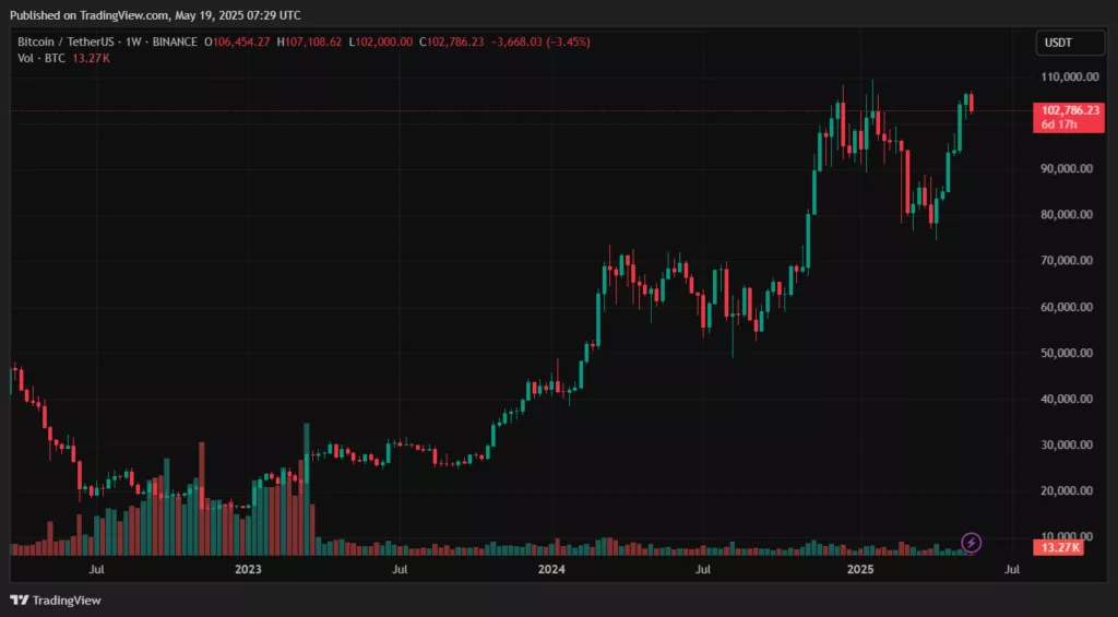 Предыдущий пиковый уровень закрытия недели составлял $104 400 в декабре 2024 года. На момент написания биткоин торгуется около $102 611 (-0,9% за сутки), согласно CoinGecko.