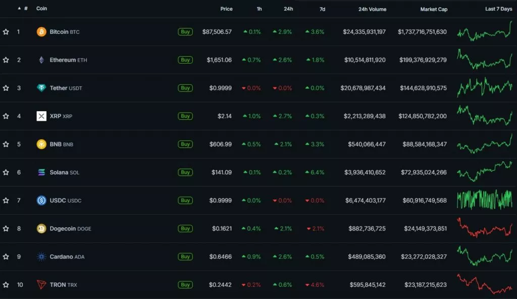 За последние сутки биткоин вырос почти на 3% и торгуется на отметках вблизи $87 500. Альткоины из топ-10 по капитализации в целом поддержали ценовое движение цифрового золота. Исключениями стали Solana (+0,2%) и TRON (+0,6%).