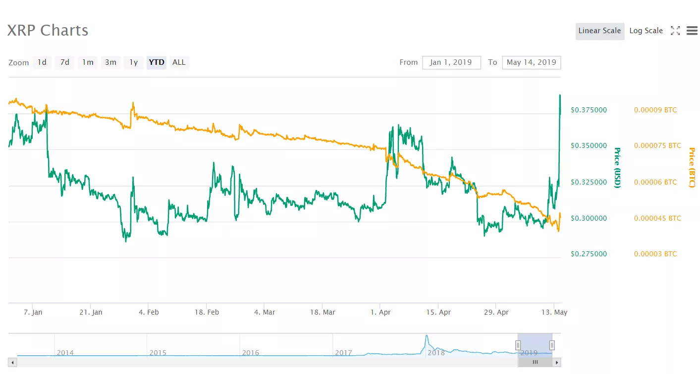 Цена токена XRP от компании Ripple продемонстрировала за последние сутки резкий рост, поднявшись в определенный момент до $0.39. Стояли за этим ростом какие-то определенные факторы или же речь идет о связанном с ростом биткоина скачком у большинства криптовалют в целом?