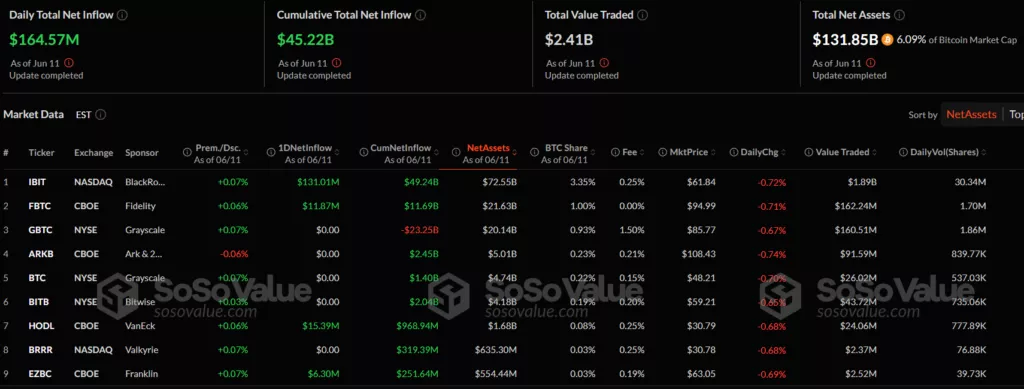 AUM провайдеров биткоин-ETF составляет $131,85 млрд. Это 6,09% от капитализации цифрового золота.
