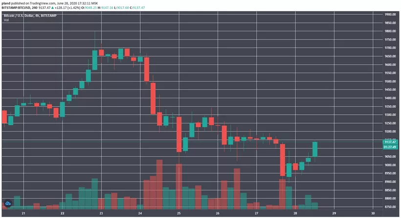 Ниже этого уровня “цифровое золото” упало вечером в субботу, 27 июня, но не надолго. На момент написания цена криптовалюты вернулась к уровням выше $9000.