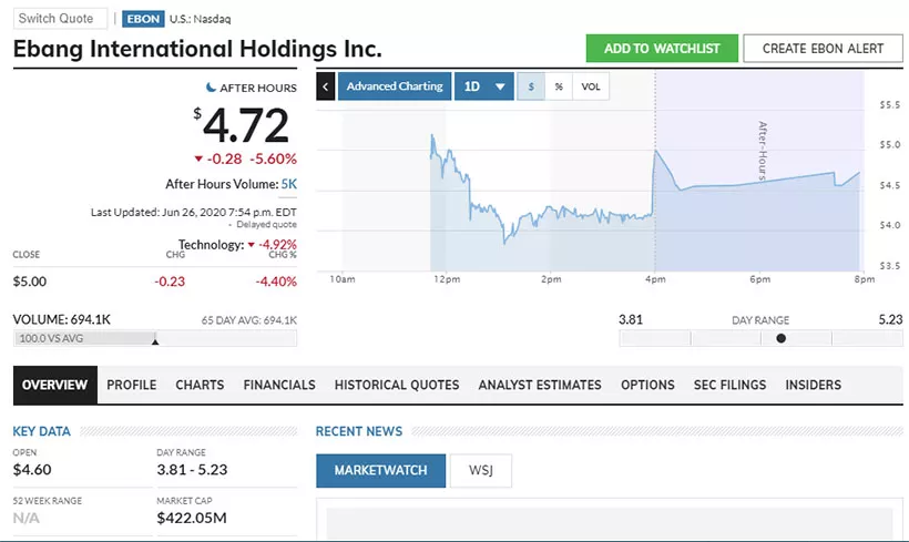 В пятницу, 26 июня, китайская компания Ebang International Holdings привлекла в ходе первичного размещения акций (IPO) на бирже Nasdaq $101 млн.