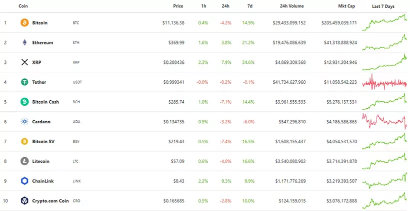 Несмотря на воскресное падение, цена биткоина за неделю прибавила почти 15%. ETH и XRP подорожали сильнее — 21,2% и 34,6% соответственно. Из ведущих только эти криптовалюты на фоне обвала остались в зеленой зоне за последние 24 часа, а также ChainLink (LINK), которая вытеснила из топ-10 Binance Coin (BNB).