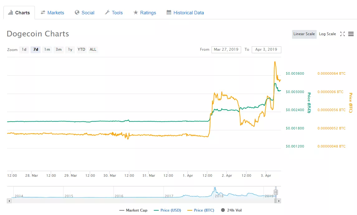 Отметим, что сама криптовалюта, которая в настоящий момент занимает 25-е место в рейтинге CoinMarketCap, начала рост еще в понедельник, до того как накануне резко рванул вверх биткоин, а вслед за ним и остальной рынок. За последние сутки, после коррекции по вторник, DOGE выросла в цене еще примерно на 25% и на момент публикации торгуется в районе $0.0031 (0.00000063 BTC).