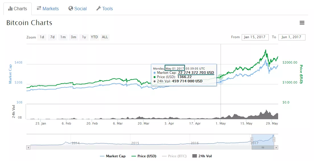 Рыночная капитализация криптовалюты Ethereum (ETH) достигла отметки $21,3 млрд. Данный показатель сопоставим с совокупной стоимостью биткоина всего месяц назад (1 мая 2017 года капитализация BTC составляла $22 млрд).