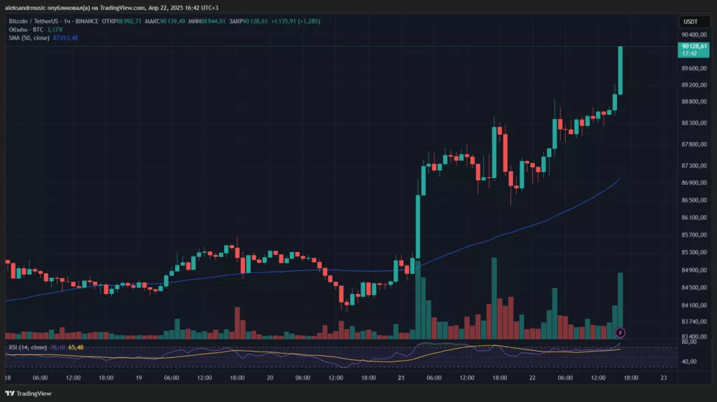 22 апреля цена первой криптовалюты преодолела отметку $90 000, достигнув уровней начала марта.