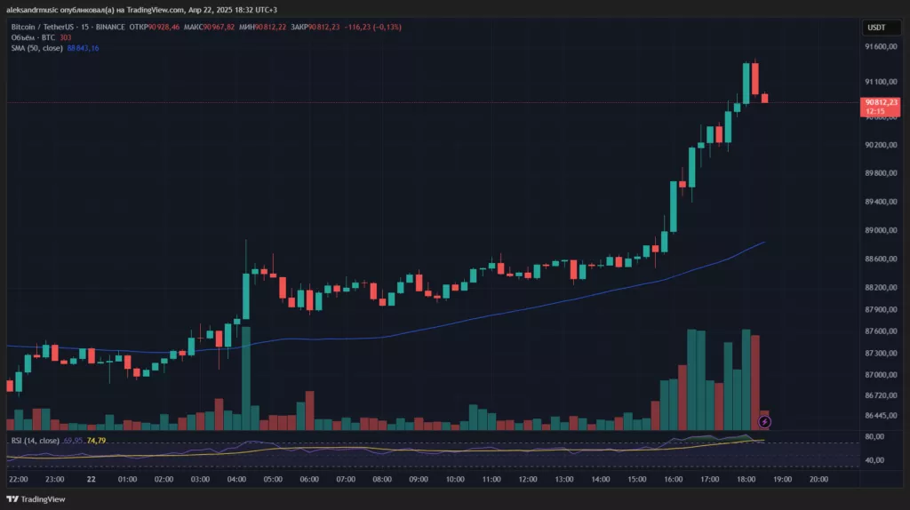 Котировки BTC/USDT на Binance достигли локального максимума на отметке $91 666.