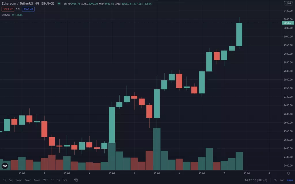 На момент написания вторая по капитализации криптовалюта торгуется на уровне $3060.