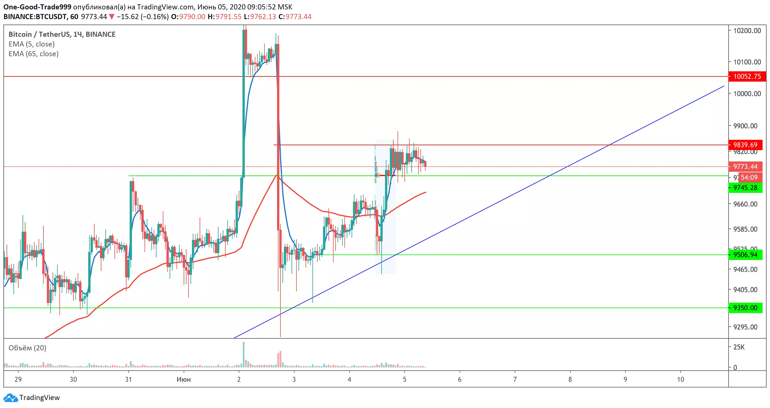 Цена BTC со вчерашнего дня пытается закрепиться над верхней границей диапазона ($9400 — 9700). На момент написания обзора биткоин торгуется в диапазоне $9750-9770.