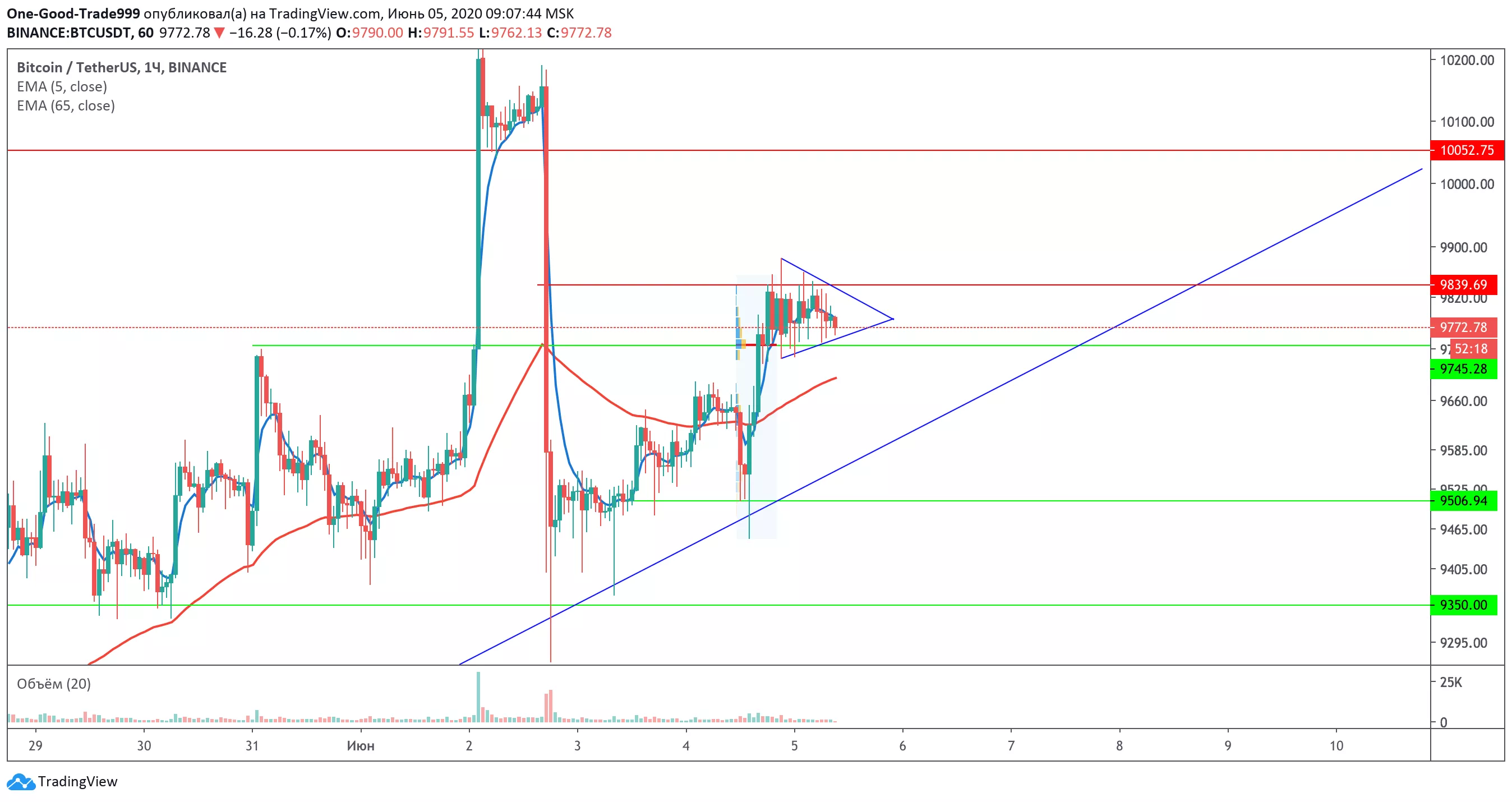 Треугольник на текущий момент — лишь гипотеза, поскольку есть вероятность снижения немного ниже, к отметкам $9650-9680, для очередного выбивания стопов покупателей.